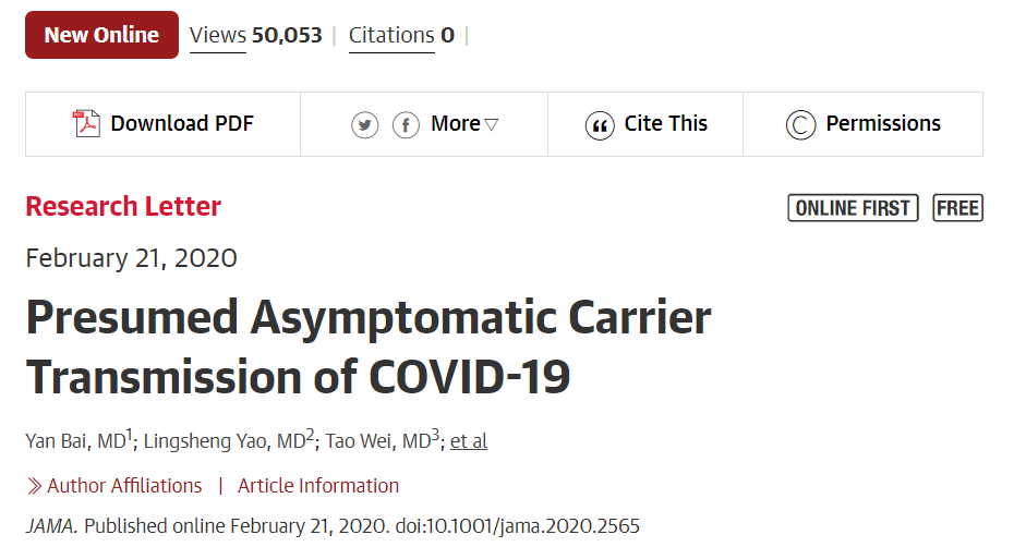 2.Yan Bai, Lingsheng Yao,et.al. Presumed Asymptomatic Carrier Transmission of COVID-19,JAMA[J]. Published online February 21, 2020