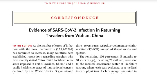 1. Sebastian Hoehl, Annemarie Berger, et.al.Evidence of SARS-CoV-2 Infection in Returning Travelers from Wuhan, China. NEJM[J]. Published online February 18, 2020