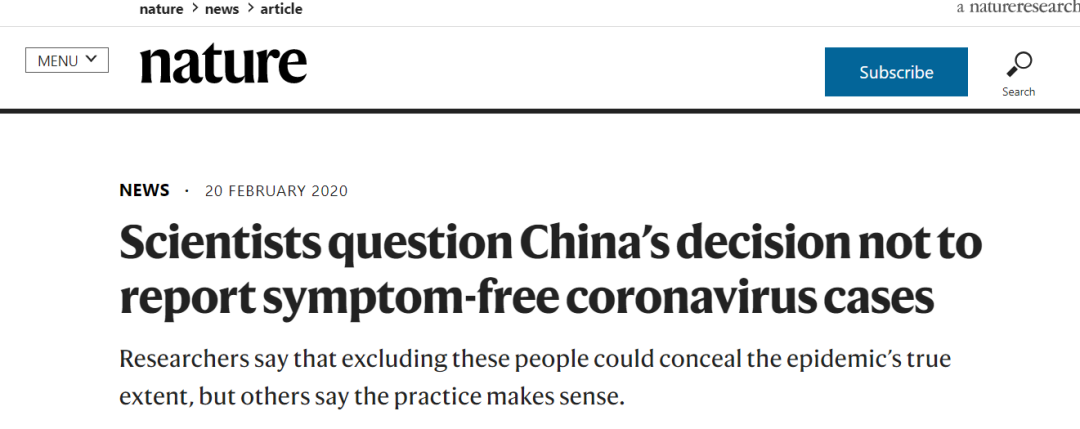 6. David Cyranoski ,Scientists question China’s decision not to report symptom-free coronavirus cases. Nature NEWS .20 FEBRUARY 2020